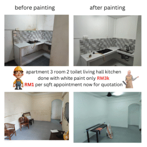 thank you customer support , apartment painting indoor with white paint and lobour only RM3k , RM1 per sqft , whatsapp us for appointment